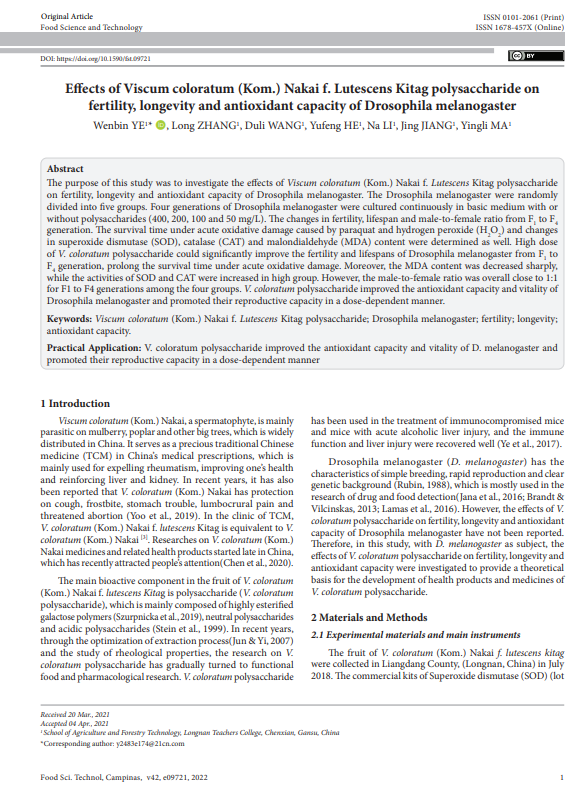近日,我校农林技术学院副教授叶文斌以第一作者身份在国际期刊《Food Science and Technology》发表题为“Effects ofViscum coloratum(Kom.)Nakai f. Lutescens Kitag polysaccharide on fertility, longevity and antioxidant capacity ofDrosophila melanogaster(黄果槲寄生果实多糖对果蝇生育力和寿命及抗氧化能力的影响)”的学术论文。